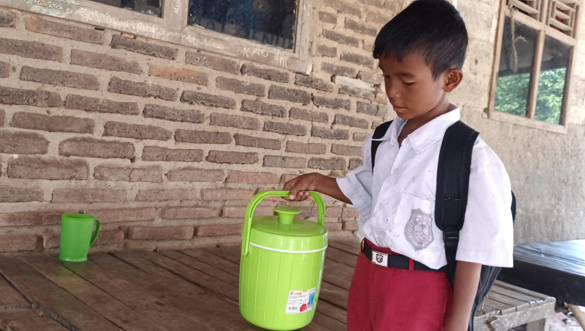 Setiap hari tak hanya alat tulis yang dibawanya, tapi juga termos es yang berisikan es lilin jualannya.